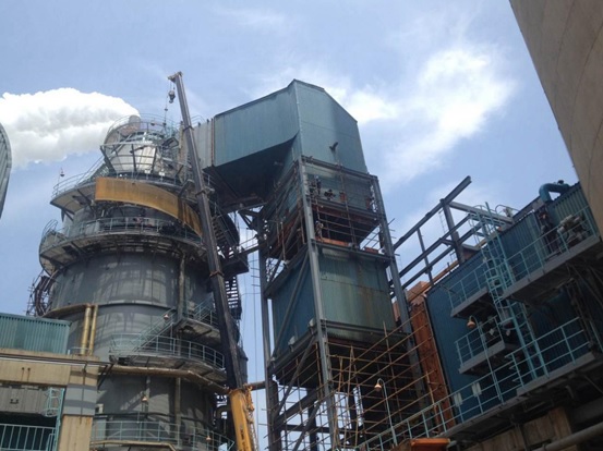 2015年5月1日11時16分,在業(yè)主、監(jiān)理、國能中電太倉項目部、施工單位以及相鄰國華太倉電廠業(yè)主的共同見證下,6#吸收塔增高施工當(dāng)天成功頂升圍板,這預(yù)示著協(xié)鑫太倉超低排放項目的建設(shè)進(jìn)度更進(jìn)一步。